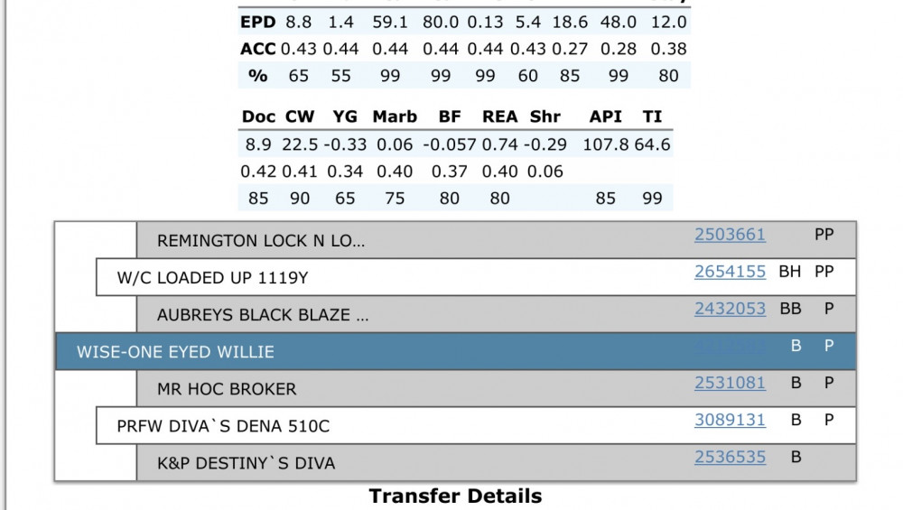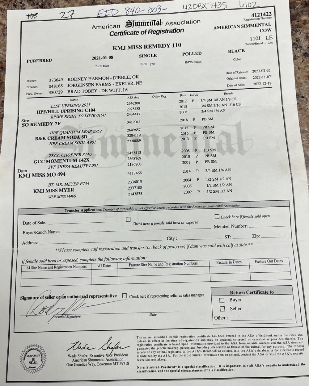 Shown in photos are service sire to the two cows which are bred to for spring calving and the two reg. papers of cows.